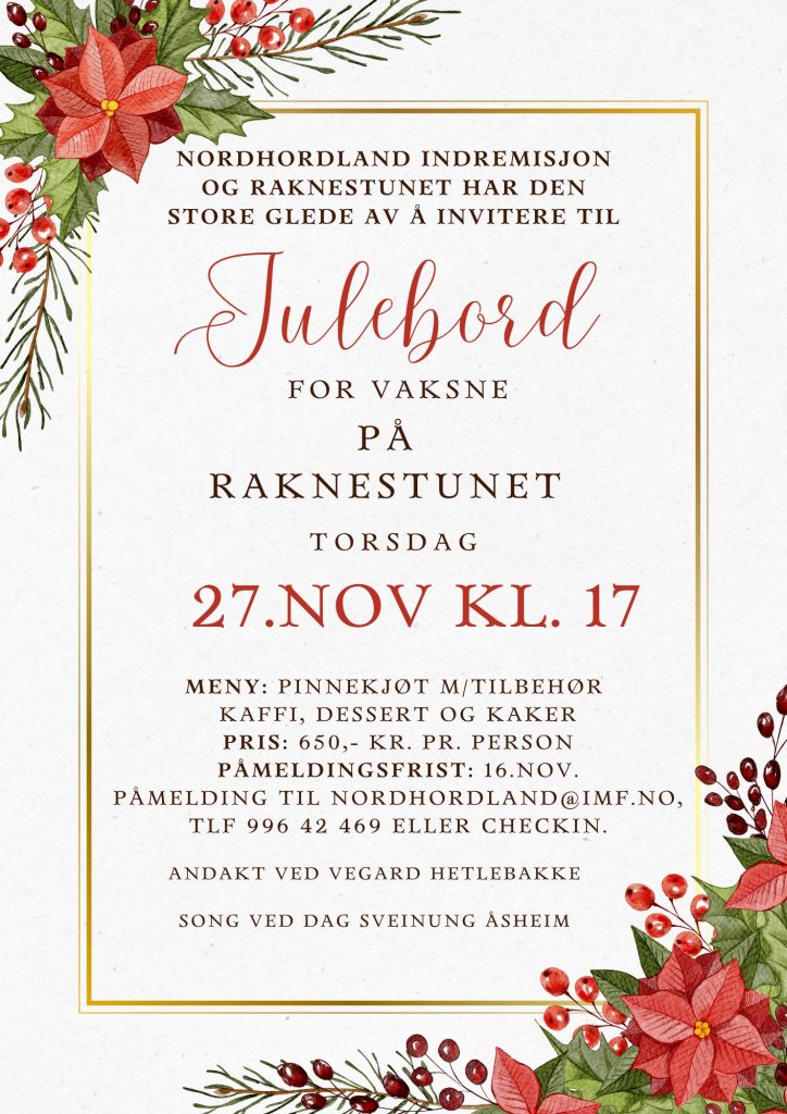 Torsdag 27.november kl. 17.00 er alle hjarteleg velkomne til julebord på Raknestunet.